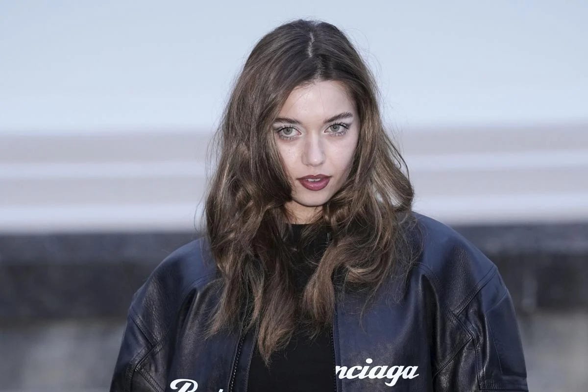 Balenciaga'nın imzası olan keskin hatlı bir ceket, oversize yapılandırılmış omuzlar ve minimalist aksesuarlarla podyumun ön sırasında boy gösteren oyuncu, gümüş tonlarındaki makyajı ve özenle arkaya taranmış saçlarıyla moda dünyasında da varlık gösteriyor.