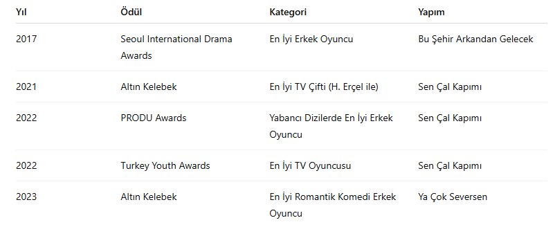 Bu Şehir Arkandan Gelecek (2017) performansıyla Seoul International Drama Awards – En İyi Erkek Oyuncu ödülünü aldı.